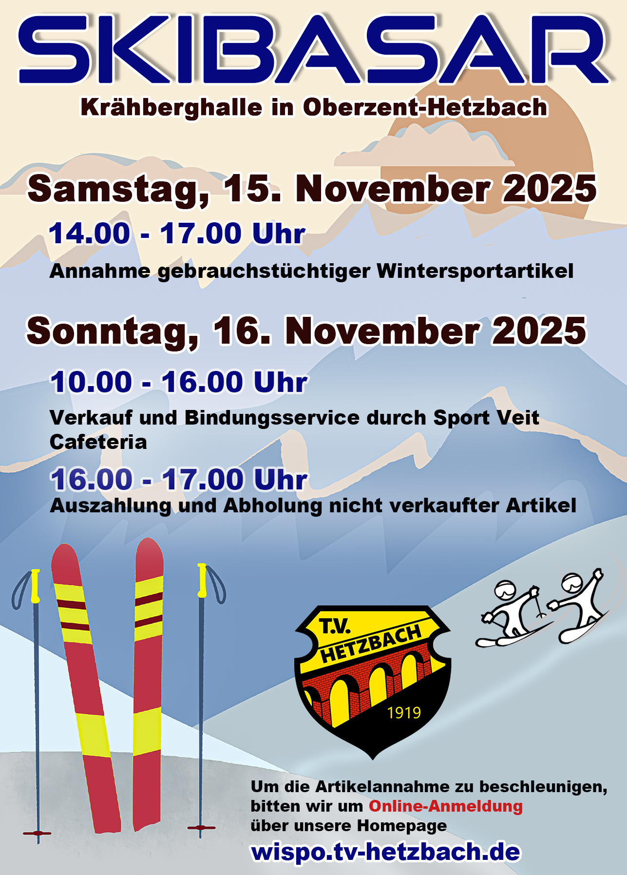Der nächste Skibasar der Wintersportfreunde des TV Hetzbach findet dieses Jahr am 15. und 16. November 2025 (eine Woche früher als gewohnt) in der Krähberghalle in Hetzbach statt. Sonntags hat wieder unsere Cafeteria geöffnet.
